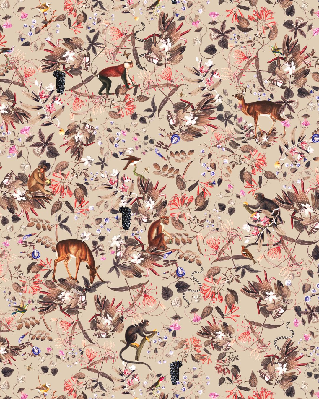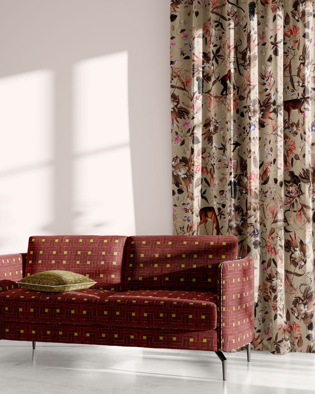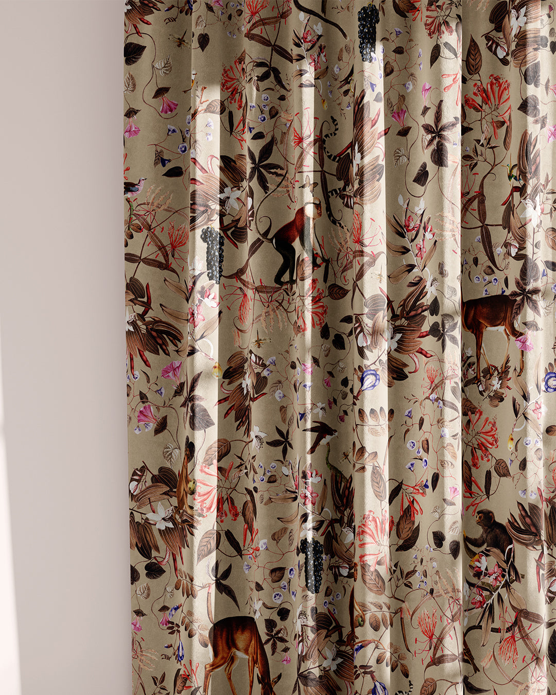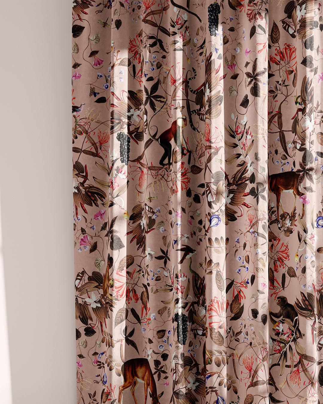 Ces rideaux imprimés du motif Orée des Bois enveloppent vos fenêtres d’une atmosphère automnale douce et feutrée. Dans une végétation aux tons prune et roux, cerfs, biches et singes se devinent entre les feuillages. Imprimés sur un velours épais au tombé élégant, ils filtrent la lumière avec délicatesse. Un choix parfait pour une ambiance chaleureuse et boisée.