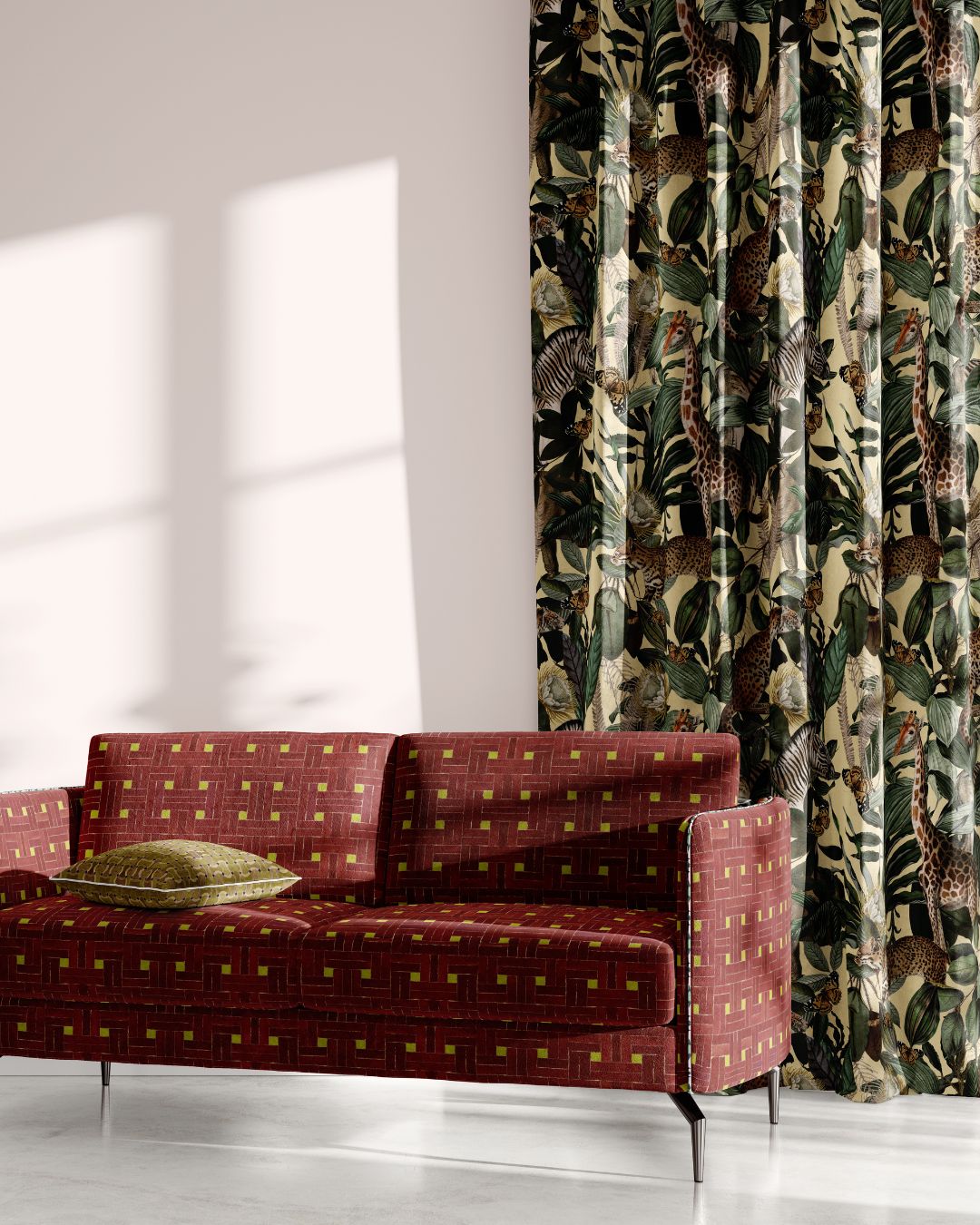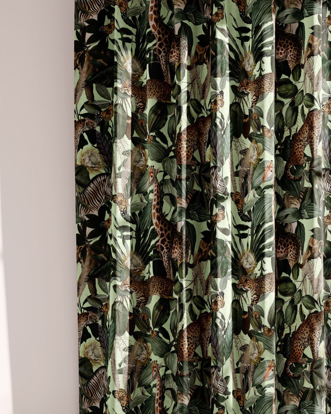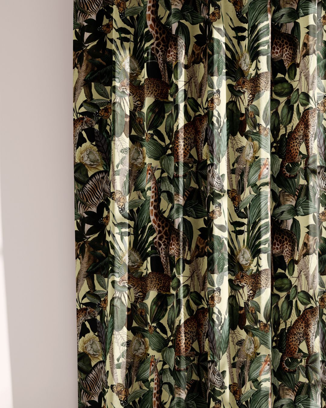 Ces rideaux imprimés du motif Savane Verte habillent vos fenêtres d’une jungle stylisée, peuplée de grands animaux paisibles. Le dessin, riche et enveloppant, filtre la lumière dans une ambiance naturelle et feutrée. Imprimés sur un velours doux et épais, ils offrent un tombé élégant, idéal pour créer une atmosphère calme et végétale.
